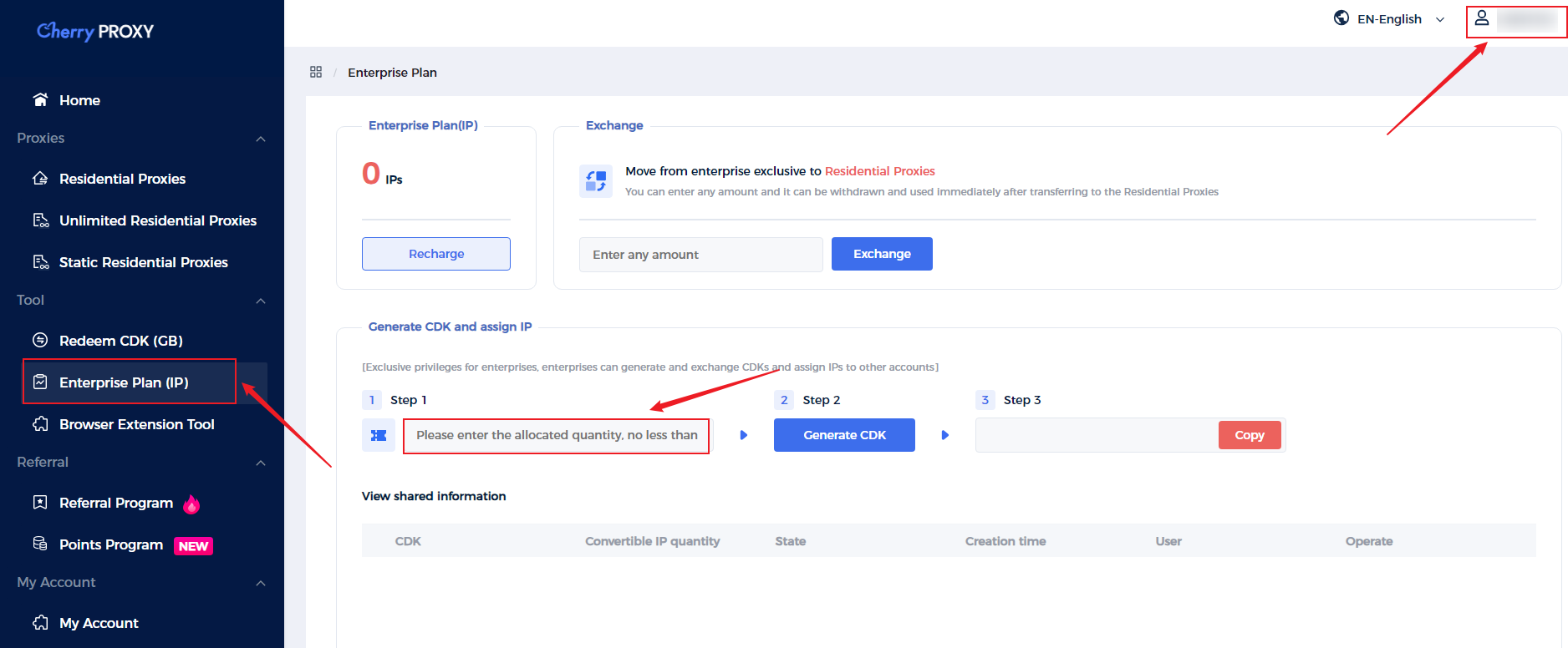 Step 3: Enter the CDKEY for the number of IPs to be transferred (note: minimum 300), and copy it to the other party for use.