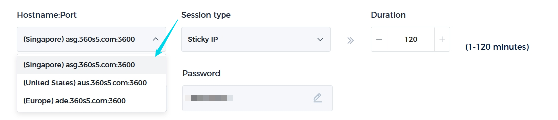 In the session type, you can choose [Sticky IP] and [Rotating IP]. When you select Sticky IP, you can set the usage time of the IP, ranging from 1 minute to 120 minutes. When you select a Rotating IP, you will get a new IP address with each request, and you will also get a new IP address randomly when the IP expires.
