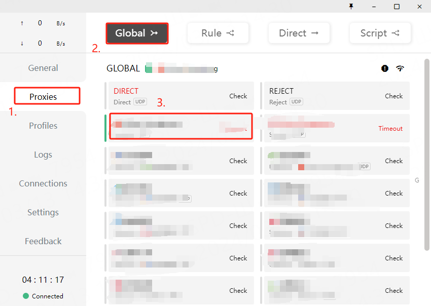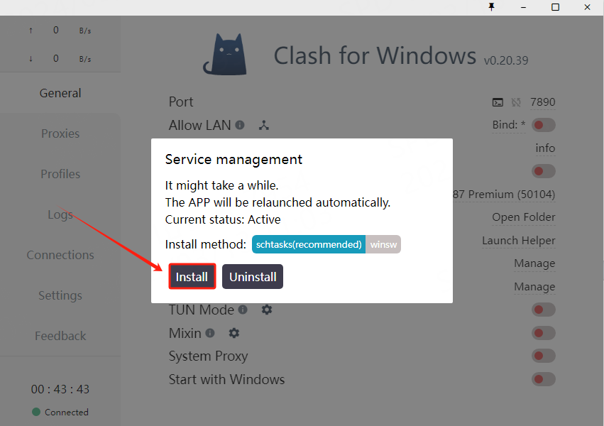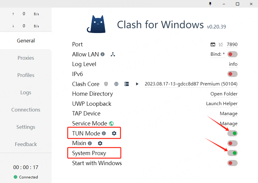 After the region icon turns green, turn on the TUN mode and System Proxy switches.