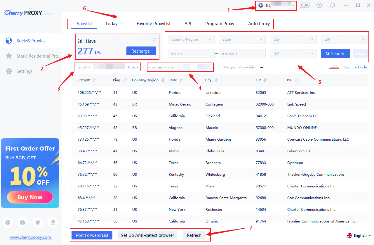 ⑤ Filter country, state, and city, support postal code search and optional IP segments