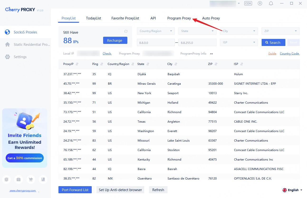Step3:In the list of Residential Proxies, you can enter the country, state, city, postal code, and ISP you want to filter in the search bar, or you can choose your own IP segment and click "Search" to obtain the IP list information you want. Select any proxy IP you want, right-click and select 'Program Proxy Connect 'from the drop-down list.