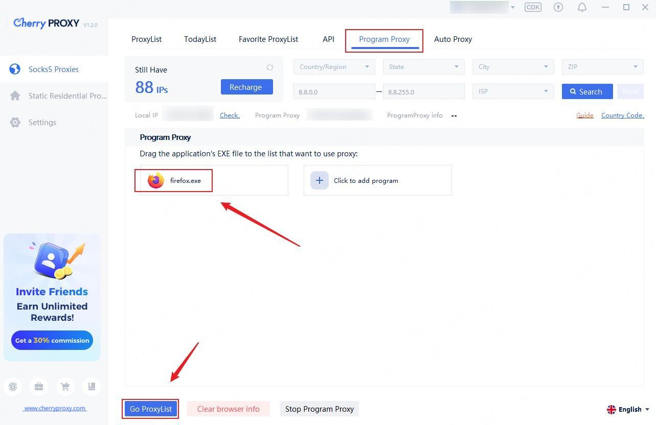 Step2:Drag the EXE file of the application to the list, and click "Go ProxyList" to return to the IP list interface.