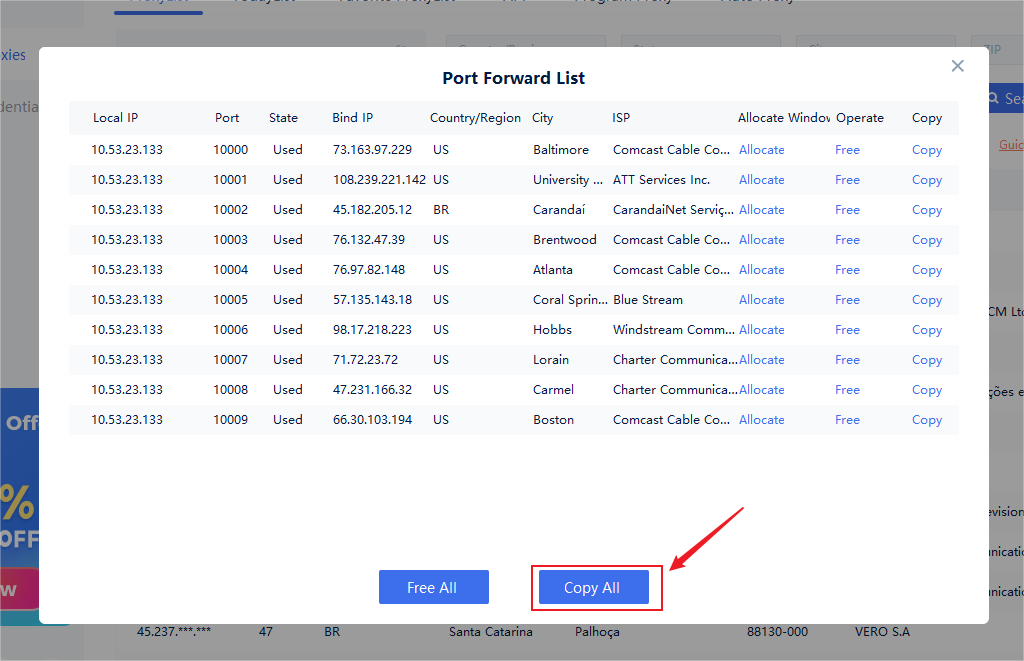 Step5:Click on the "Port Forward List" button to obtain detailed port information. Click 'Copy All' to directly copy the local IP address and port.