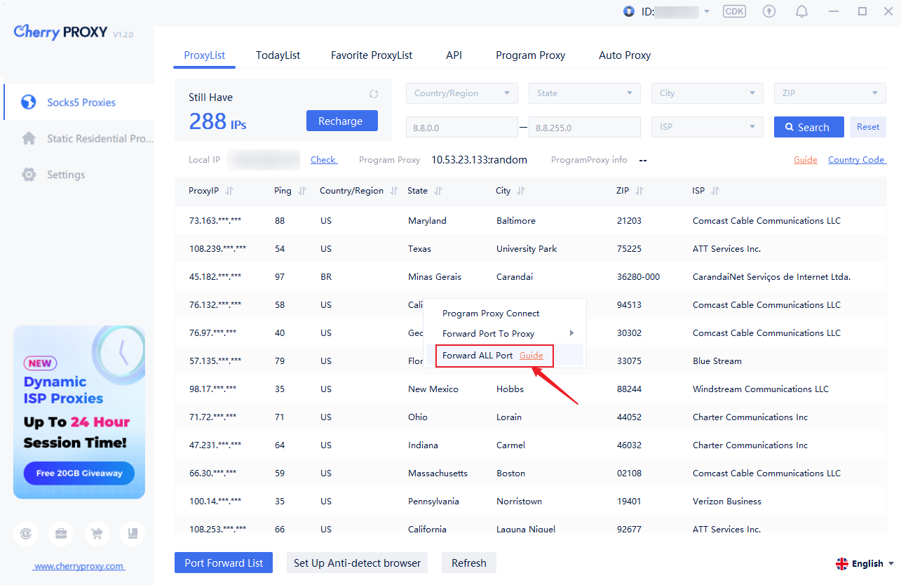 Step4:Select a proxy in the IP list, right-click, select the  "forward all ports" to be proxy, select the proxy port location to be forwarded in the drop-down list, and complete the IP extraction.