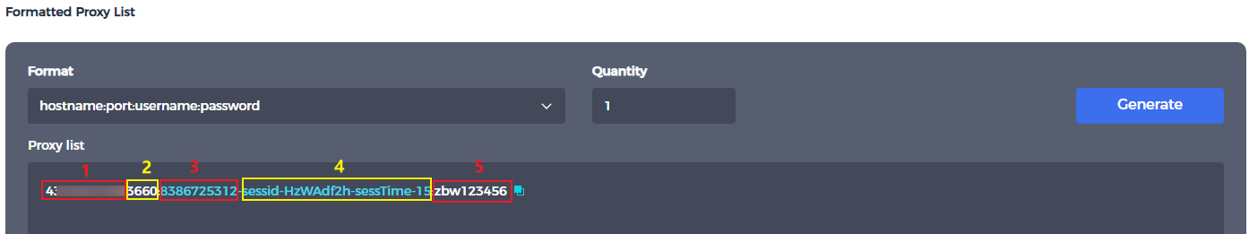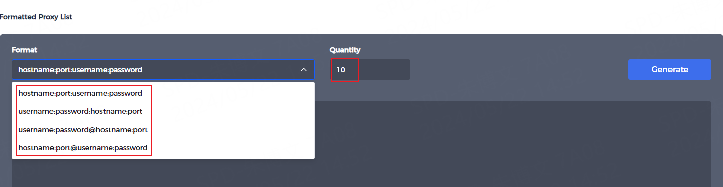 第五步:在這裡您可以選擇代理的格式和數量,數量範圍是1-10000,點擊產生即可輸出代理清單。您可以將其直接複製到任何應用程式或工具中,或者產生可以匯入到其他工具中的.txt或.csv檔案。