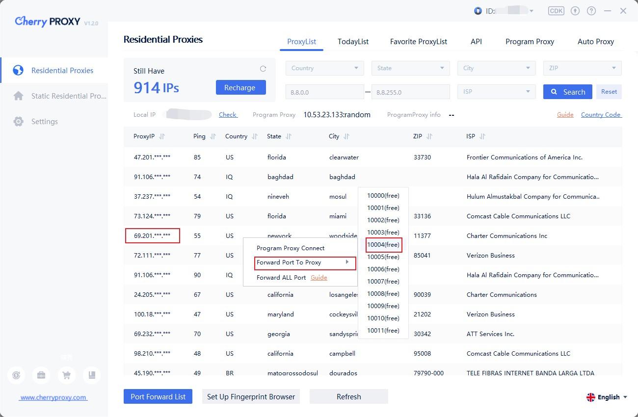 3.在代理列表介面,右鍵設置轉發端口到代理。