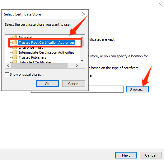 Select 'Place all certificates in the following store'