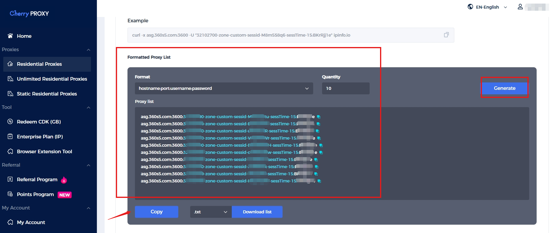 Step 3:  Select the required number of IPs, click "Generate", then click "Copy" to obtain the required test commands!