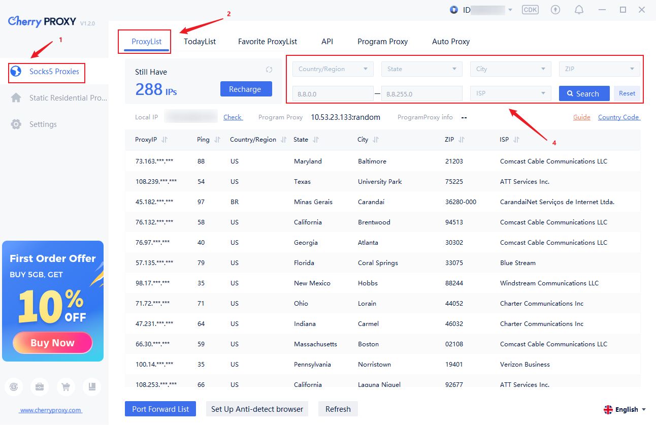 Step3:Click on the "Socks5 Proxies" button to filter the desired country, state, and city, support postal code, ISP search, or optional IP segments, and click "Search" to obtain a list of available IPs.