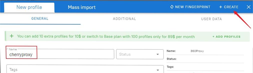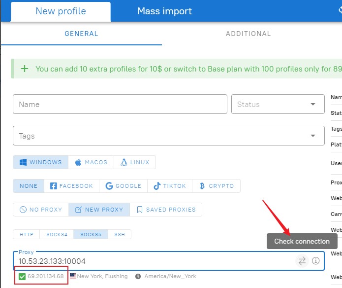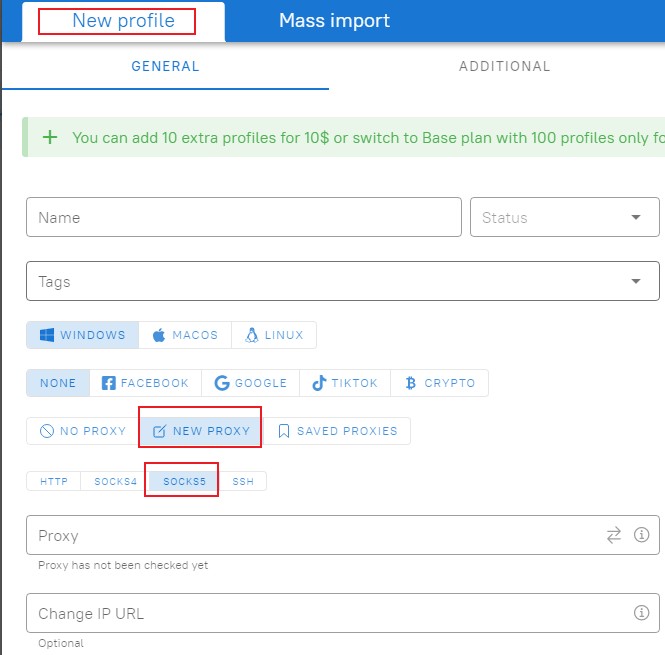 Step 5. Open the Dolphn{anty} software, click CREATE PROFILE, enter New Profile, and select proxy settings.