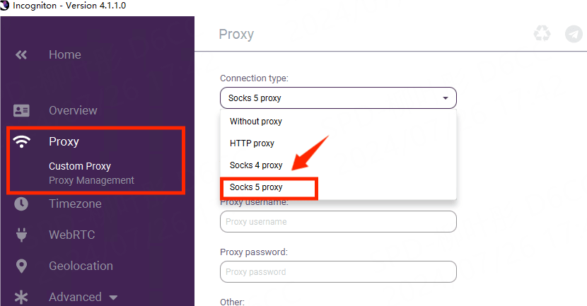 Step 3. Open the Incogniton client and go to the "Proxy" page. Select "Socks5 proxy" as the connection type.