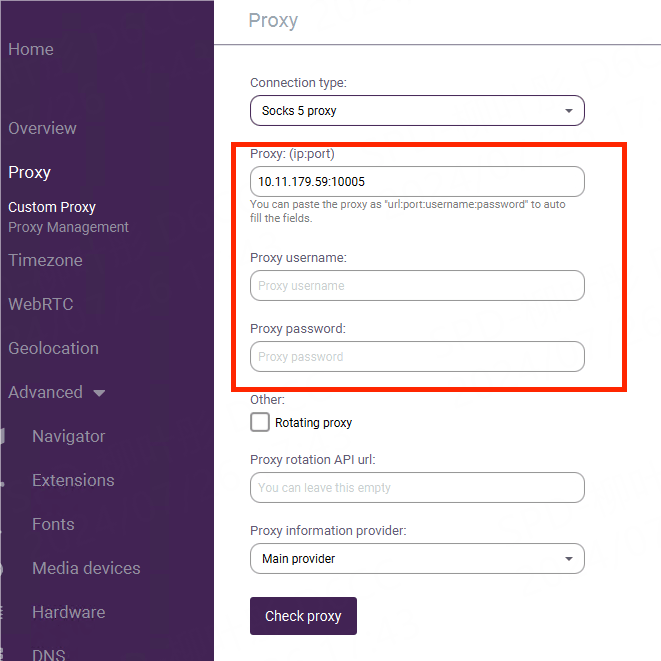 Step 4. Paste the local IP and port in the "Proxy: (ip:port)" field, and then enter your username and password.