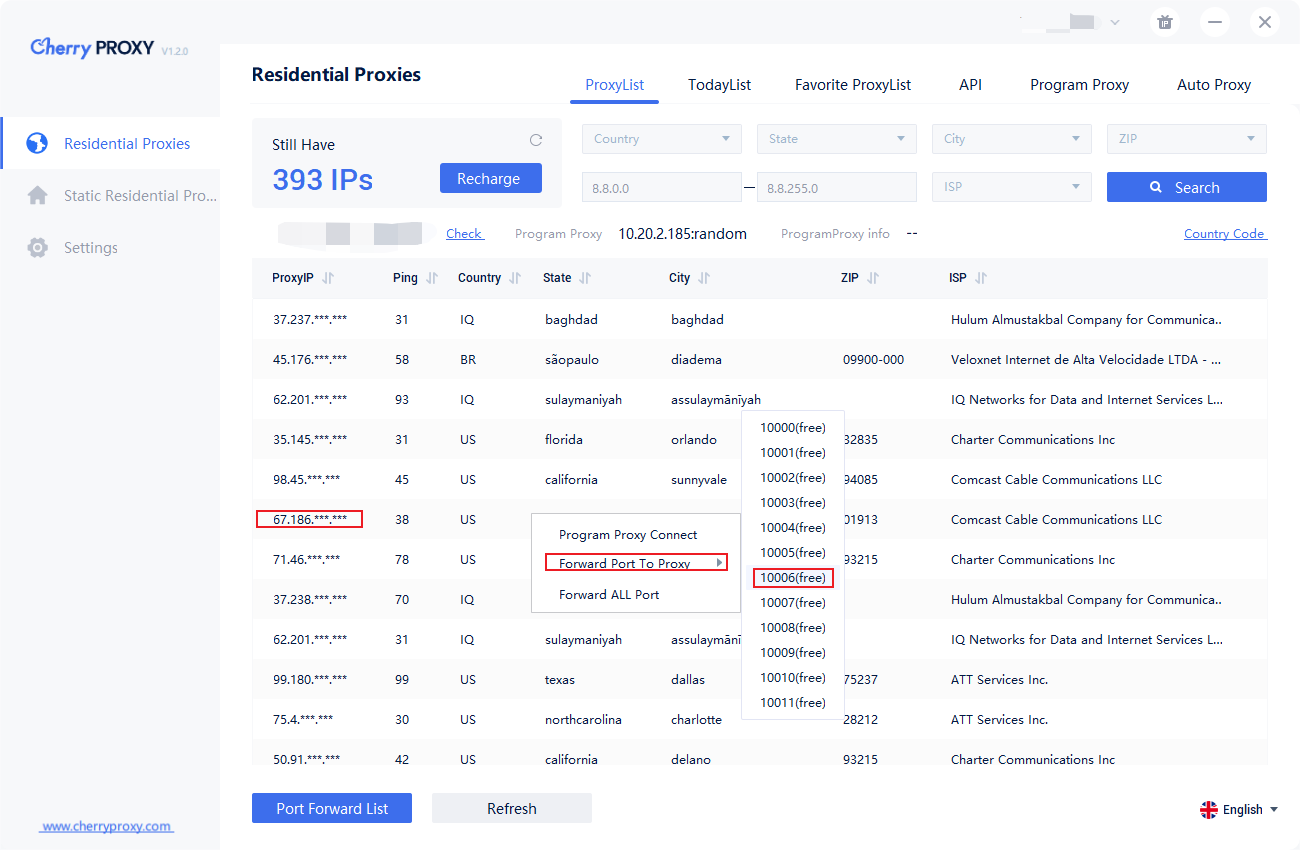 3. 在代理列表界面,鼠標點擊右鍵設定轉發端口到代理。
