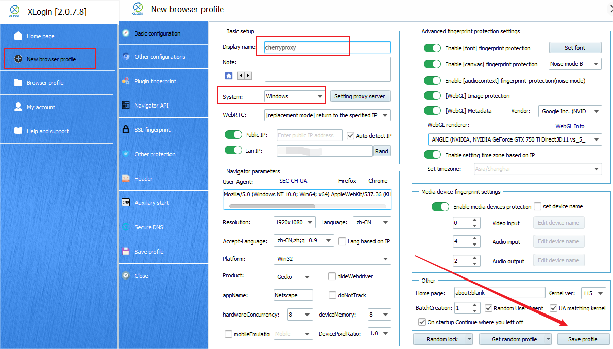 5.註冊並登錄Xlogin帳戶(https://xlogin.us/?sub=360)並下載客戶端。3天免費試用測試全部功能。建立新瀏覽器-編輯顯示名稱-選擇系統並儲存。