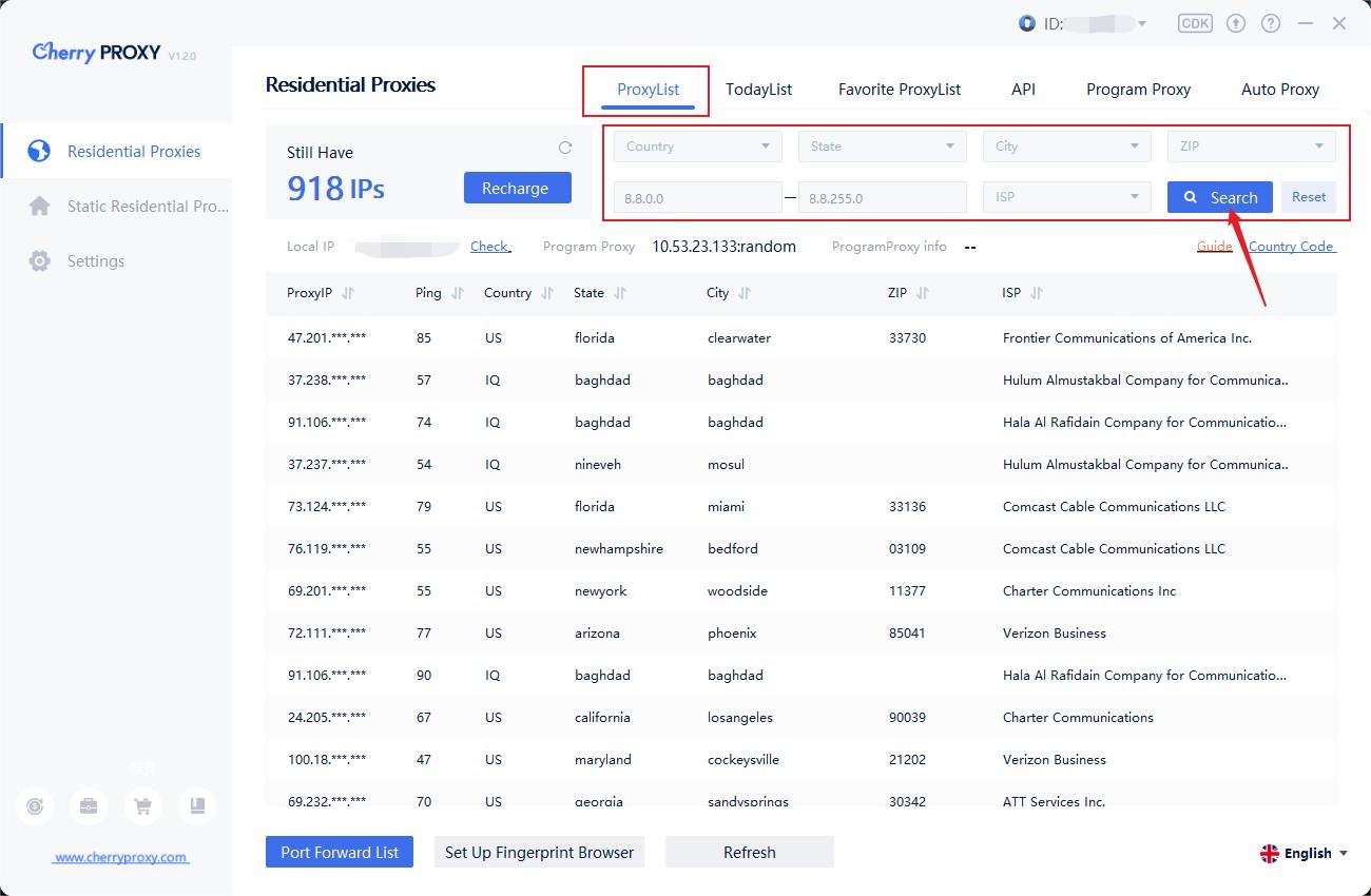 2.開啟客戶端,在界面中選擇代理列表。篩選國家/州/城市,點選「檢索」即可取得目標區域的IP清單。