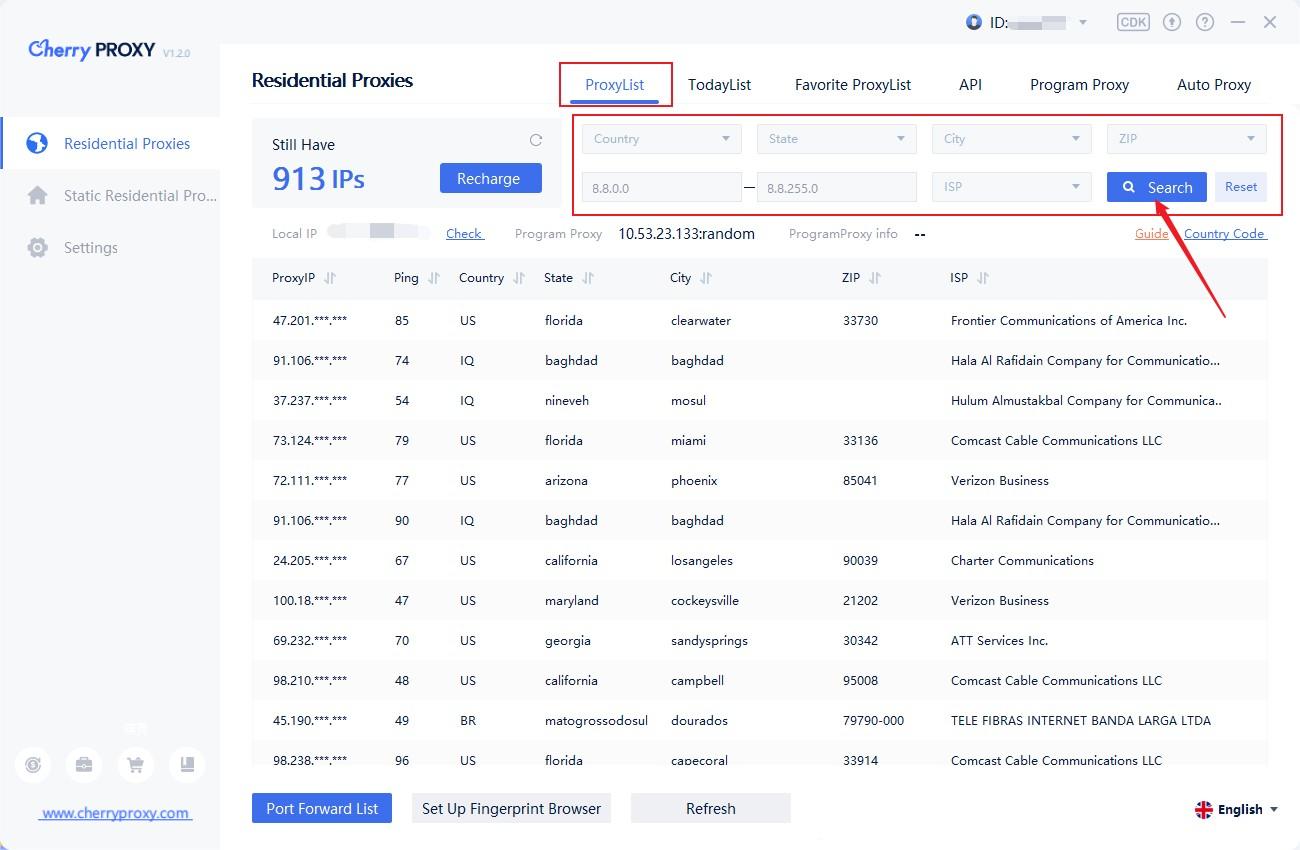 2. 開啟客戶端,選擇代理列表。篩選國家/州/城市,然後按一下「檢索」即可取得目標區域的 IP 列表。